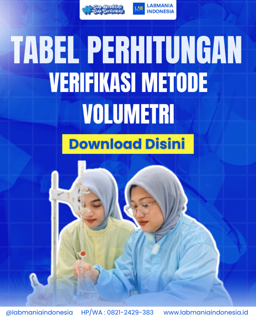Tingkatkan akurasi verifikasi metode volumetri di laboratoriummu dengan Tabel Perhitungan Verifikasi Metode Volumetri dari Labmania Indonesia! Template ini membantu kamu menghitung hasil verifikasi dengan cepat, tepat, dan siap digunakan untuk kebutuhan akreditasi. Praktis digunakan oleh analis, teknisi, dan penyelia laboratorium. Download tabelnya di sini dan optimalkan pekerjaan laboratorium Anda!