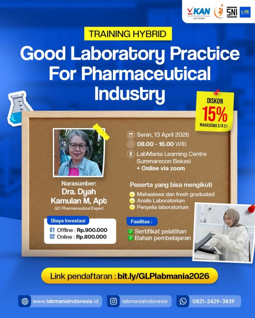 Jangan lewatkan kesempatan untuk mengikuti Workshop 2 Hari Good Laboratory Practice (GLP) for Pharmaceutical Industry yang diselenggarakan oleh LabMania Indonesia, lembaga pelatihan pertama bersertifikat KAN untuk SNI ISO 29993:2017. Workshop ini akan dilaksanakan pada Senin, 13 April 2026 , pukul 08.00–16.00 WIB, di LabMania Learning Center, Summarecon Bekasi, dalam format hybrid (tatap muka & online).