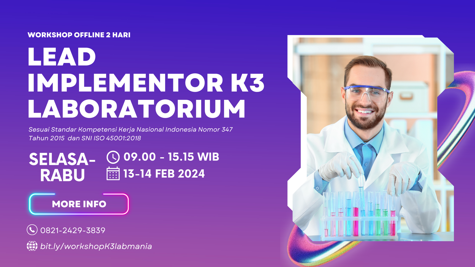 Oleh karena itu, Labmania Indonesia akan membantu meningkatkan kompetensi Sahabat Labmania dibidang K3 Laboratorium dengan mengadakan Workshop Offline Lead Implementor K3 Laboratorium dalam bentuk workshop offline di Bekasi untuk membahas lebih detail tentang langkah menjadi Lead Implementor K3 laboratorium.
