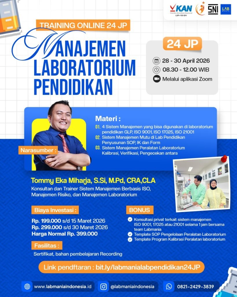 Untuk menjawab kebutuhan tersebut, Labmania Indonesia menghadirkan Training Online Manajemen Laboratorium Pendidikan 24 JP yang akan diselenggarakan pada 28 – 30 April 2026 melalui Zoom. Training ini dirancang khusus untuk membantu pengelola laboratorium memahami sistem manajemen laboratorium yang efektif dan sesuai standar.